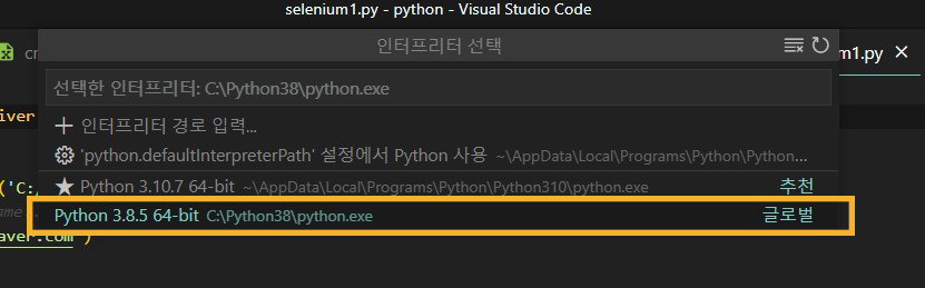 위의 두가지를 실행하고도 selenium 모듈을 찾을 수 없다는 에러와